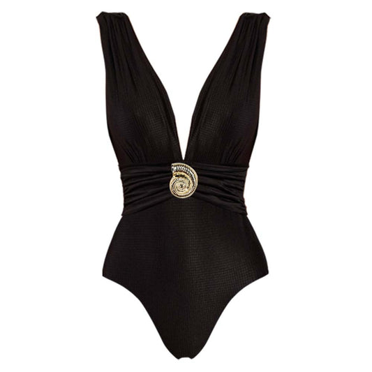 Ruched V-Neck Swimsuit with Shell Accent