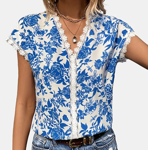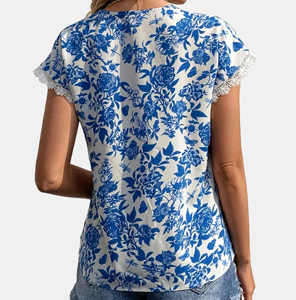 A pretty china blue and white, floral printed top with lace trim.